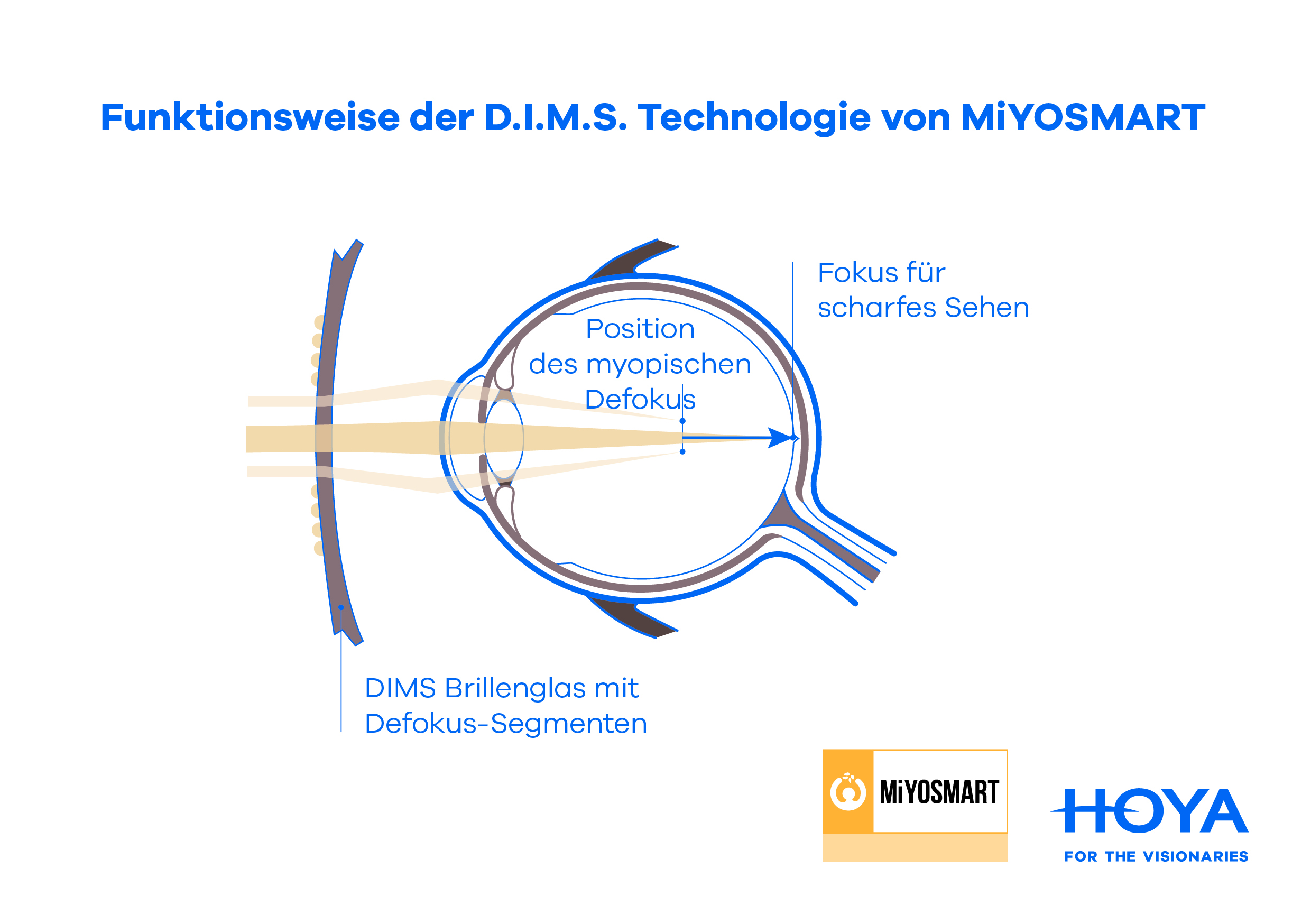 Die Gläser basieren auf der D.I.M.S.-Technologie (“Defocus Incorporated Multiple Segments”), bei der hunderte kleine Segmente auf der Glasvorderfläche einen myopischen Defokus erzeugen, während ein zentraler Bereich für die Vollkorrektion sorgt. Die Anwendung erfolgt in enger Zusammenarbeit mit Augenärzten, Orthoptik und Optikern, inklusive regelmäßiger Kontrollen.